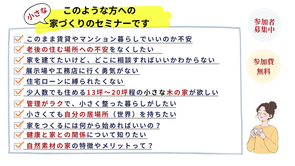「家づくりって何から始めればいい?」「ハウスメーカーの家と、ところで何が違うの?」「間取りの悩み」「どのような土地に建てればいいの?」「自然住宅って何?」「本当に安心な素材・家づくりとは?」etc.。